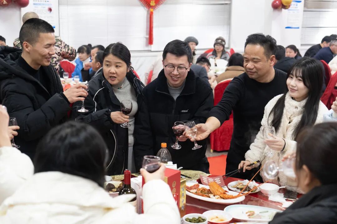 美味佳肴陆续上桌,热气腾腾的菜品承载着团圆的喜悦,大家举杯共饮,清脆的碰杯声与欢声笑语交织在一起。